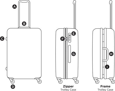 - Accessories – which cover the wheels, handles, combination lock. Zipper head/puller & studs that break off and are no longer usable.